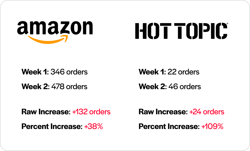 First, I tested metrics based on absolute order counts. I tested ranking merchants based on raw number of orders per week and raw weekly order increases.