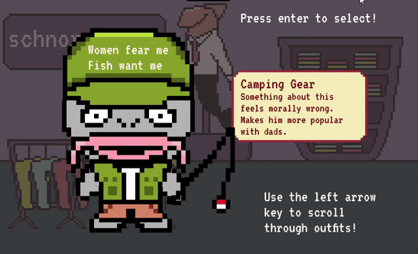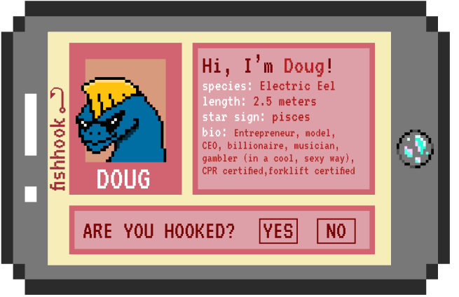 The bachelor I wrote and designed for this game is named Doug who’s a catfish, both figuratively and literally. He poses as an electric eel but he’s quite the unattractive fellow when you meet him in person. But maybe his real beauty is on the inside...